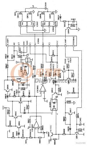 受控電壓VCC 不僅直接加到電源控制芯片IC8004 12腳(供電端),為其內(nèi)部的控制電路供電,而且經(jīng)R8050、R8052 加到IC8004 的⑧腳和11腳,為IC8004 內(nèi)的末級放大器Q1 和Q2 供電。