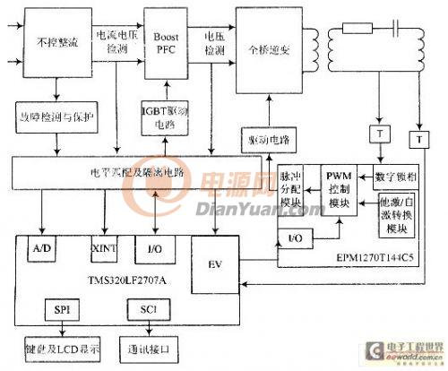 控制系統(tǒng)主要采用Altera公司的MAXⅡ系列CPLD芯片EPMl270T144C5和TI公司的TMS320LF2407A型DSP??刂骗h(huán)節(jié)由數(shù)字鎖相環(huán)、PWM控制模塊、分時(shí)脈沖控制模塊、DSP移相功率調(diào)節(jié)環(huán)節(jié)以及DSP-PFC環(huán)節(jié)組成。CPLD鎖相環(huán)模塊跟蹤負(fù)載諧振頻率,同時(shí)接收DSP輸出的數(shù)字移相角大小,從而經(jīng)PWM、分時(shí)模塊計(jì)算輸出8路移相觸發(fā)脈沖。DSP計(jì)算負(fù)載輸出功率,與功率設(shè)定值比較,經(jīng)積分分離PI算法輸出移相角度;DSP還要對(duì)CCM模式下的軟開(kāi)關(guān)Boost電路進(jìn)行平均電流控制。此外還要實(shí)現(xiàn)設(shè)置、保護(hù)以及顯示等功能。