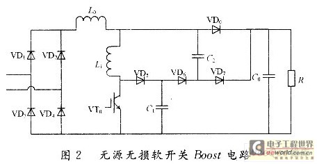 圖2所示為無(wú)源軟開(kāi)關(guān)Boost電路、串聯(lián)電感及無(wú)損SNUBBER電路。與普通的Boost電路相比,增加電感L1限制因VD0的反向恢復(fù)而產(chǎn)生的VT0開(kāi)啟沖擊電流,C2→VD7作為VD0的SNUBBER電路,VD5→VD6→VD7的串聯(lián)結(jié)構(gòu)和L1→C1→C2之間的諧振與能量轉(zhuǎn)換也有利于抑制VT0的開(kāi)啟沖擊電流。