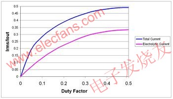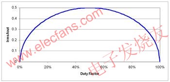 圖1給出了該表達(dá)式的曲線圖;它是一個(gè)圓形,其中,50%占空比時(shí)達(dá)到最大值0.5,并在0%和100%占空比時(shí)有2個(gè)零交叉。該曲線在50%占空比附近對(duì)稱。在20%和80%之間,RMS電流和輸出電流之間的比大于80%。使用這一范圍的占空比,您可以將RMS電流粗略估計(jì)為1/2最大輸出電流。在這一范圍之外,您需要進(jìn)行相應(yīng)的計(jì)算。