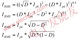 注:下面是輸入電容中RMS電流的推導(dǎo)過程,其假設(shè)電感無窮大。它以矩形脈沖(D0.5*Ipk)的RMS電流作為開始,并去除了DC組件(D*Ipk)。