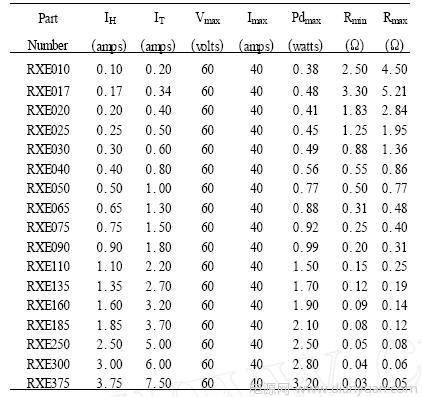 PolySwitch元件有多種系列產(chǎn)品,其產(chǎn)品特性各不相同。以常用的RXE系列元件為例,其20℃時的電氣特性如表1所示。