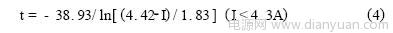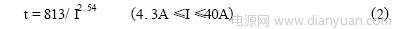 由表1可知,RXE系列PolySwitch元件所能承受的最大電流為40A。該點與臨界點之間為曲線的直線部分。設(shè)動作時間為t(秒),故障電流為I(安),考慮到橫軸、縱軸均為對數(shù)坐標(biāo),兩者之間應(yīng)具有如下數(shù)學(xué)關(guān)系: