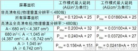 傳統(tǒng)上,全球眾多志愿性及規(guī)范機構的標準都著眼于降低電子產(chǎn)品的待機能耗,美國、歐盟等地的眾多國際規(guī)范對電視產(chǎn)品的待機能耗要求為1 W,而中國中標認證中心(CSC)要求為3 W。而隨著液晶電視尺寸越來越大,其能耗也越來越高。由于液晶電視市場份額越來越大,規(guī)范機構也越來越關注平板電視工作狀態(tài)下的能耗對電網(wǎng)的累積影響。如“能源之星”發(fā)布了電視產(chǎn)品第3版工作能耗要求(見表1)。