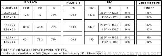 本參考設計的重點在于以高能效的架構提供極佳的參數(shù)性能,這架構在所有電源轉(zhuǎn)換段的工作損耗都較低。下面的表3中介紹了一些典型的性能數(shù)據(jù),其中反激及PFC段的負載為不同測試負載條件下的負載。逆變器能效為估計值,因為直接在高壓燈上精確地測量輸出功率非常困難,而且精度不夠高。在典型負載條件下,PFC在完整線路輸入范圍下的能效高于95%,反激轉(zhuǎn)換器在37 W典型負載配置下的峰值能效為78%。顧及根據(jù)所采用的交叉穩(wěn)壓技術的不同5 V和12 V輸出上出現(xiàn)的額外損耗,這個數(shù)值可謂相當不錯。逆變器的能效得到的優(yōu)化,這要歸因于全橋零電壓開關拓撲結構將開關損耗減至最小。支撐它的一項論據(jù)是這樣的事實:全橋MOSFET使用表面貼裝DPAK器件,不需要任何額外散熱片。
