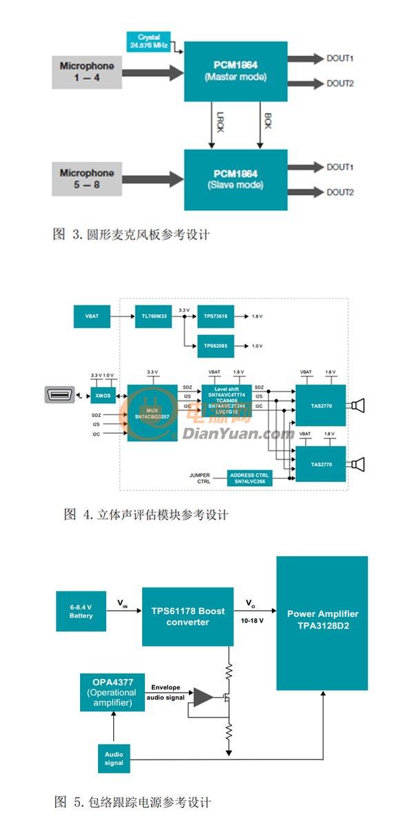 在采用多麥克風(fēng)設(shè)計(jì)和語音識別時(shí),我們也無需重新設(shè)計(jì)。基于PCM1864 的TI 圓形麥克風(fēng)板(CMB) 參考設(shè)計(jì)使用兩個(gè)4 通道音頻ADC 與一組模擬麥克風(fēng)(最多含八個(gè))連接,并且可以在嘈雜的環(huán)境中提取清晰的用戶語音指令。