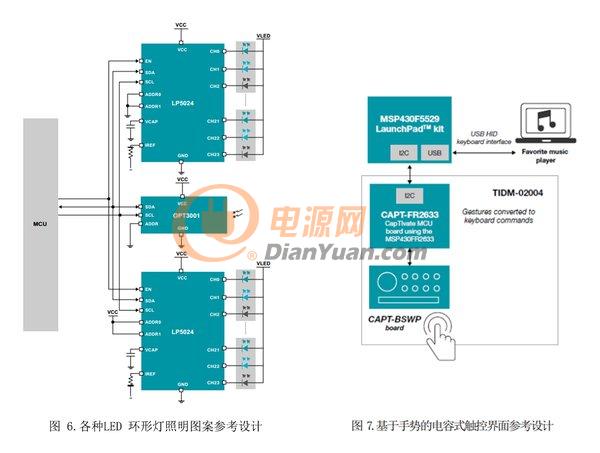 各種LED 環(huán)形燈照明圖案參考設(shè)計(jì)說明了如何使用裝有集成式LED 引擎的新型多通道RGB LED 驅(qū)動器設(shè)計(jì)多色RGB LED 環(huán)形燈圖形子系統(tǒng)。使用環(huán)境光傳感器 IC 可自動控制LED 亮度。