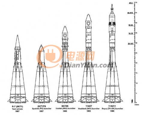 蘇聯(lián)太空運載火箭的演變,人造衛(wèi)星發(fā)射器從左數(shù)第二。