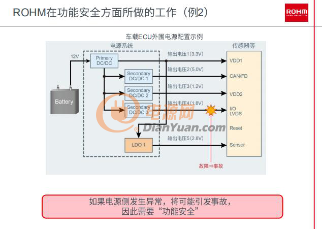 另外,車(chē)載ECU外圍電源配置示例,是羅姆針對(duì)功能安全在電源方面所作的提升。我們知道當(dāng)ADAS、EPS外圍電源正常供電時(shí),如果一旦供電發(fā)生異常該如何提升功能安全?針對(duì)這個(gè)問(wèn)題羅姆推出了一個(gè)簡(jiǎn)便的方案?!霸诂F(xiàn)有的電源構(gòu)架不變的情況下,加一個(gè)電源監(jiān)控的IC,通過(guò)向電源輸出的狀態(tài)進(jìn)行監(jiān)控,再通過(guò)我芯片對(duì)于監(jiān)控的狀態(tài)實(shí)時(shí)的反饋狀態(tài)給到ECU,來(lái)傳達(dá)供電給的各個(gè)部分哪一路出問(wèn)題了,對(duì)于系統(tǒng)端也可以有效的去進(jìn)行功能安全策略上的對(duì)應(yīng)。它的優(yōu)勢(shì)就在于可以沿用現(xiàn)有的電源構(gòu)架,只要加上羅姆的芯片就可以幫助客戶(hù)系統(tǒng)端去提升?!崩畲喝A先生介紹道。