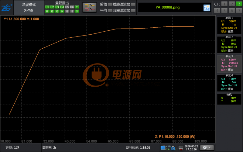 功率分析儀測(cè)試交流輸入功率和直流輸出功率,設(shè)置電子負(fù)載從空載到滿載,使用功率分析儀的 X-Y 的顯示模式,可以直接測(cè)試到效率和功率因數(shù)從空載到滿載的曲線圖。
