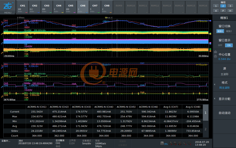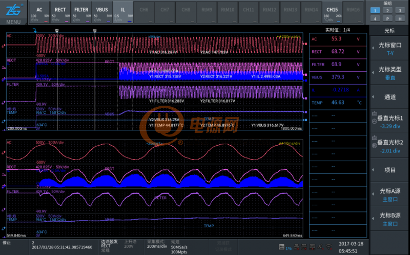 異常捕獲:電源產(chǎn)品在長(zhǎng)時(shí)間運(yùn)行時(shí),不知道會(huì)出現(xiàn)什么問(wèn)題,示波器無(wú)法設(shè)置觸發(fā)條件,不容易捕捉到異常,而使用示波記錄儀記錄波形后可進(jìn)行回看,有效捕獲異常波形;