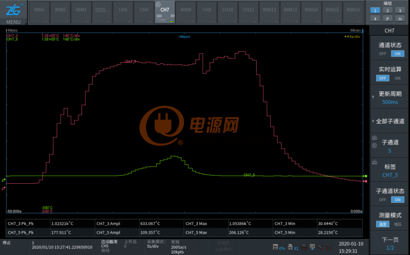 設(shè)備中關(guān)鍵部位的溫度異常會(huì)導(dǎo)致設(shè)備性能下降甚至損壞。因此溫升測(cè)試是產(chǎn)品研發(fā)過(guò)程中必不可少的一項(xiàng)。使用 ZDL6000 可以靈活組合電壓采集卡、16 通道卡、溫度采集卡等多種板卡同步測(cè)量。例如在溫升測(cè)試中就可以裝配 100M 卡與溫度卡,同步測(cè)試器件工作電壓、電流以及關(guān)鍵部位的溫升情況。