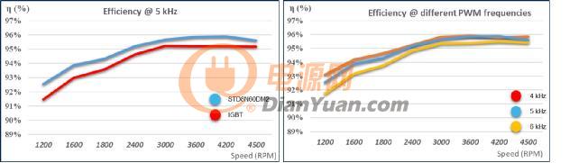 圖2:MDmesh快速二極管款MOSFET與DPAK封裝IGBT在壓縮機(jī)逆變器應(yīng)用中的能效曲線比較圖。試驗(yàn)條件:0.23Nm (負(fù)載),220V/50Hz (輸入電壓)