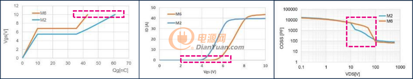 圖3:從M2到M6:柵極電荷、閾值電壓和輸出電容三項(xiàng)指標(biāo)被全面改進(jìn)