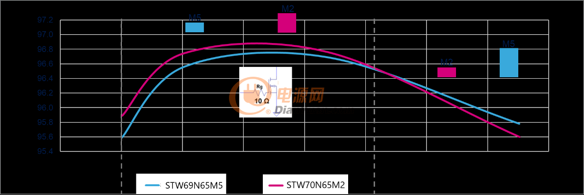 圖6描述了“定制型”M5系列和基本型M2系列在功率較高的1.5kW功率因數(shù)校正電路中的能效比較。兩個(gè)MOSFET具有相似的導(dǎo)通電阻(M5和M2的導(dǎo)通電阻分別為37和39 mOhm)和反向耐壓(650V)。