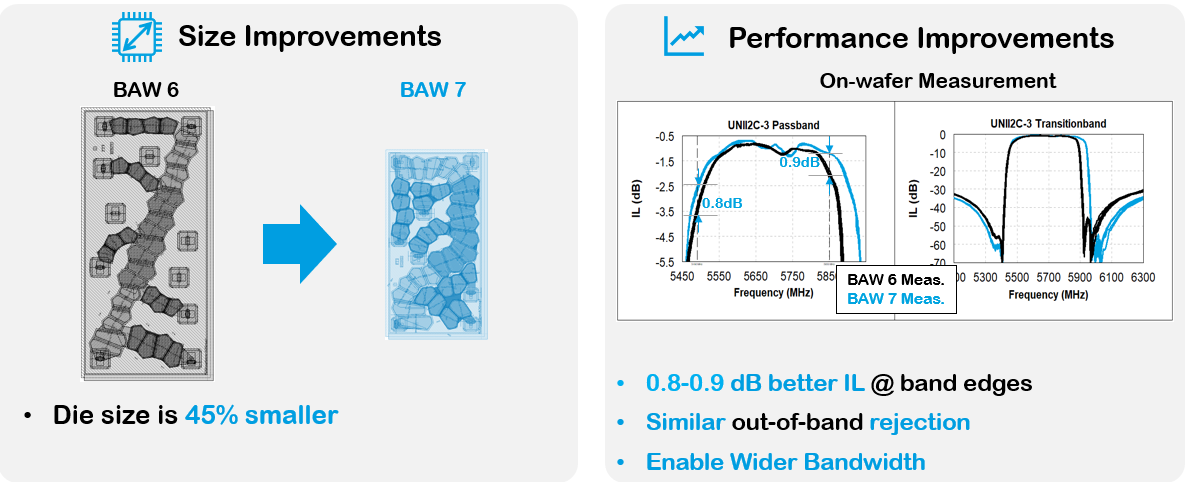 圖10顯示了基于相同U-NII 2c-3 (5470MHz-5835MHz)濾波器設計,但在使用BAW 6與BAW 7工藝時所表現(xiàn)出的差異。在尺寸方面,BAW 7的裸片面積相比BAW 6縮小了45%,使得在相同尺寸的晶圓上可切割的濾波器裸片數(shù)量增加約45%,從而有助于降低成本。從濾波器能效的部分來看,根據(jù)實際的晶圓上測量結(jié)果,BAW 7的插入損耗可降低0.8dB-0.9dB,表現(xiàn)出類似的帶外抑制能力及支持更寬的通道帶寬。