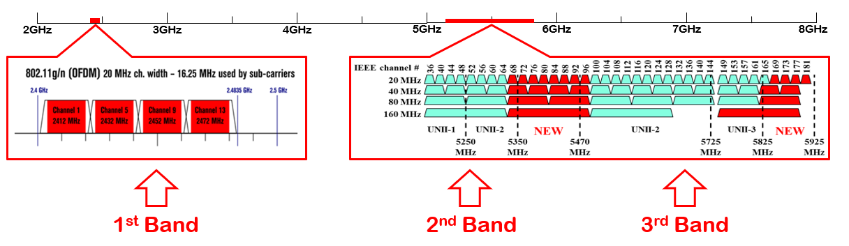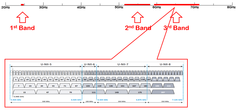 在Wi-Fi 6E之前,所謂的“三頻”是通過將5GHz頻段(U-NII1-U-NII3,即5150MHz-5835MHz)劃分為兩個子頻段實現(xiàn)的,這兩個子頻段分別是U-NII1–2a(5150MHz-5350MHz)和U-NII 2c–3(5470MHz-5835MHz),如圖2所示。