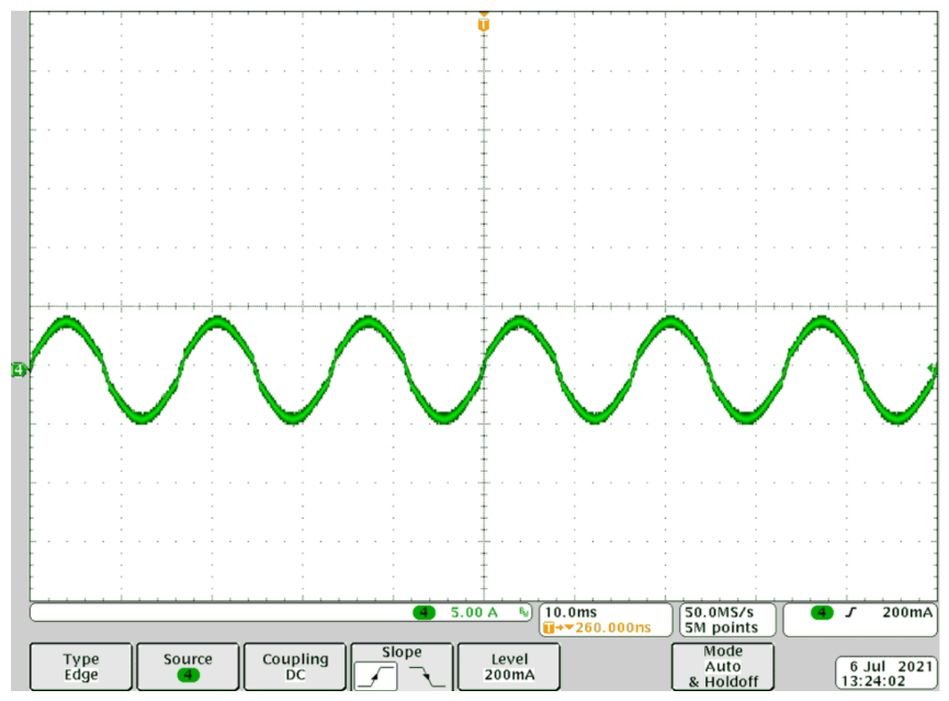 已在 360W PFC 評估模塊 (EVM) 上驗(yàn)證了這一建議的控制方法。圖 7 顯示了輸入電流波形,從中可以看到良好的正弦電流波形。
