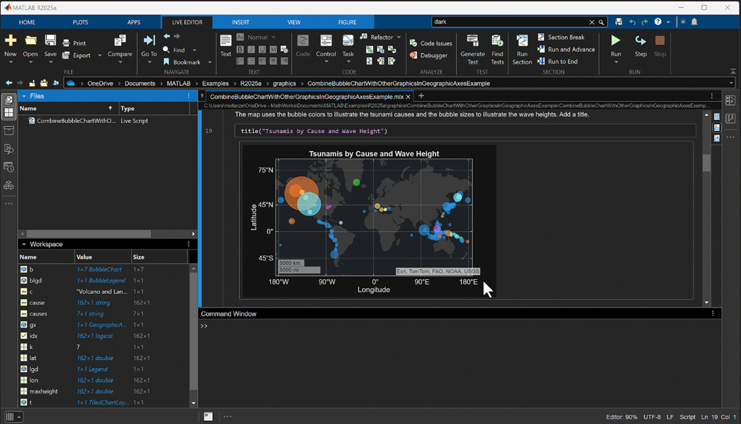 圖注:MATLAB 最新版桌面包含深色主題和用于編碼及軟件開發(fā)任務(wù)的新側(cè)欄面板。