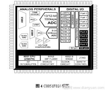 CPU單元的任務比較多,主要要完成對由DSP單元送來的信號再處理分析。CPU單元還分別控制鍵盤單元、時鐘單元、LCD單元、LED單元等輔助單元和GSM單元工作。對CPU單元的要求是高速和低功耗。這里選用美國Cygnal公司的C8051F020。C8051F020單片機[8]是集成在一塊芯片上的混合信號系統級單片機(圖4),芯片上有8個8位數字I/O端口,其中四個與標準的8051的端口(P0、P1、P2、P3)相同,與5V兼容。I/O端口在功能上有所增強,每個I/O端口都可獨立地設置為推挽輸出或開漏輸出和弱上拉,這為一些低功耗系統設計提供了節(jié)省電源的手段。C8051F020單片機除了具有51系列單片機的特點外還有如下的特點: