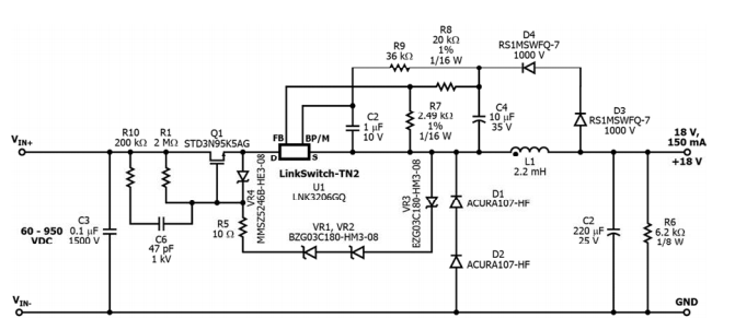 LNK3206設(shè)計開發(fā)的 StackFET Buck電源,支持60 VDC – 950 VDC輸入,可以承受1100伏直流電壓,輸出電壓18.0 V / 150 mA 。高度集成的解決方案,盡可能低的元件數(shù),無需光耦來調(diào)節(jié)。