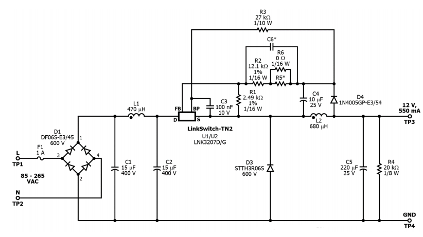 LNK3207開發(fā)的LED電源,采用buck拓?fù)浣Y(jié)構(gòu),電源的輸入電壓范圍85 VAC – 265 VAC,輸出電壓 12 V,電流 550 mA。是一款不錯(cuò)的低成本低功耗高效率的LED驅(qū)動(dòng)器。