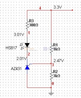 最近看公司一款開關(guān)電源,如圖所示,在3.3V輸出端取樣,測(cè)得各點(diǎn)電壓如圖所示,我不明白的是AZ431陰極電壓小于2.5V,電路竟然也可以工作,參考輸出為2.47V,請(qǐng)知道原因的解釋一下,謝謝!并且這個(gè)電路流過陰極電流小于1mA,而AZ431建議最小工作電流為1mA,請(qǐng)問這樣工作有什么不好的地方?