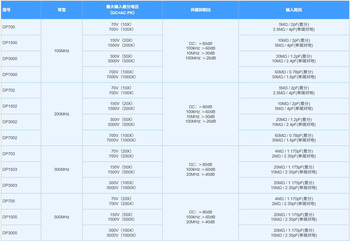 帶寬:100MHz-500MHz差分電壓:高達(dá)7000Vpk精度:±2%共模抑制比:>-80dB雙量程切換5MHz帶寬限制(200MHz及以下帶寬型號(hào)支持)接口:標(biāo)準(zhǔn)BNC接口