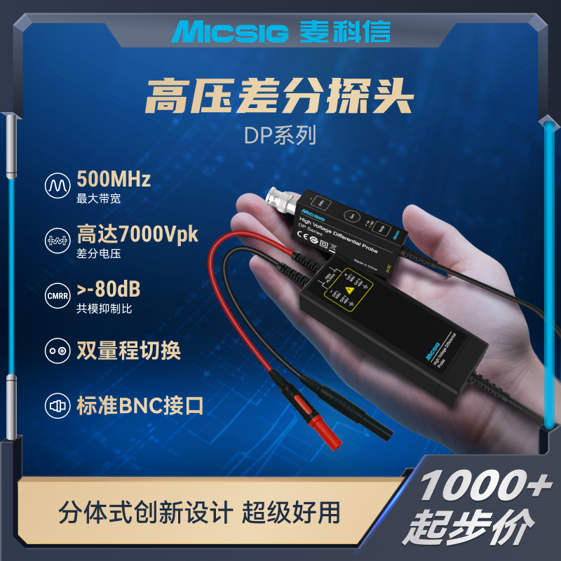 麥科信DP系列高壓差分探頭可選帶寬為100MHz至500MHz,最大輸入差分電壓達(dá)7000Vpk,采用標(biāo)準(zhǔn)BNC接口設(shè)計(jì),適用所有品牌示波器??刂颇K與信號(hào)盒采用高密度集成設(shè)計(jì),僅 2cm 超薄厚度,體積小巧輕便,輕松適配各種測(cè)試環(huán)境,節(jié)省臺(tái)面空間。探頭具備一鍵秒速調(diào)零、過(guò)載保護(hù)報(bào)警功能,實(shí)現(xiàn)千伏級(jí)高壓信號(hào)的精準(zhǔn)捕捉。內(nèi)置強(qiáng)金屬屏蔽,抗干擾能力強(qiáng),共模抑制比>-80dB(DC)。低至5mVrms超低底噪(DP700在10X檔5MHz帶寬限制下),雙量程設(shè)計(jì)為不同測(cè)試電壓提供更佳信噪比。采用高阻設(shè)計(jì)和低輸入電容設(shè)計(jì),最小化負(fù)載效應(yīng),測(cè)量精度達(dá)±2%。5MHz帶寬限制功能有效抑制高頻噪聲和干擾,在新能源汽車電驅(qū)、第三代半導(dǎo)體等高頻高壓場(chǎng)景中,為工程師提供更具效率的測(cè)量方案。