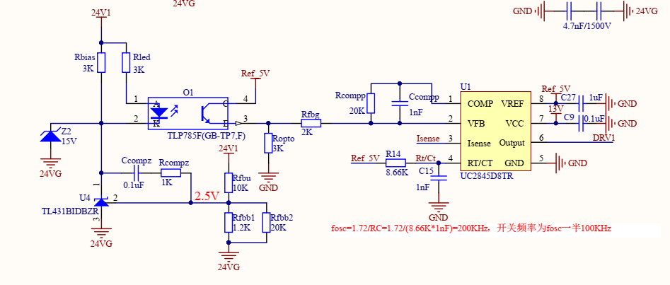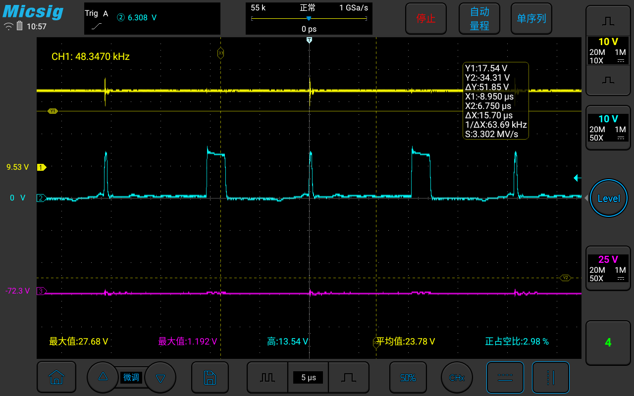 反激開關電源,黃色是24V輸出波形,藍色是原邊mos管波形,占空比波動較大,變壓器有輕微聲音。環(huán)路是不是不穩(wěn)定?在某些負載下,占空比是穩(wěn)定的,變壓器也沒有聲音。
