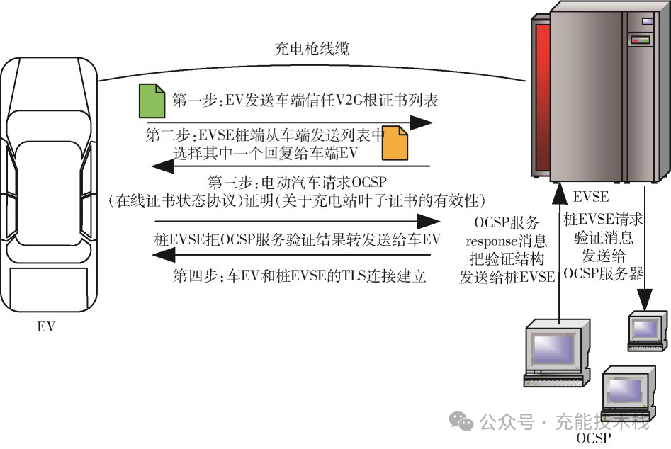 (3)如果電動汽車請求OCSP(在線證書狀態(tài)協(xié)議)證明(關(guān)于充電站葉子證書的有效性),充電站會通過CSO(充電站運營商)獲取OCSP 響應(yīng),并將其轉(zhuǎn)發(fā)給電動汽車。