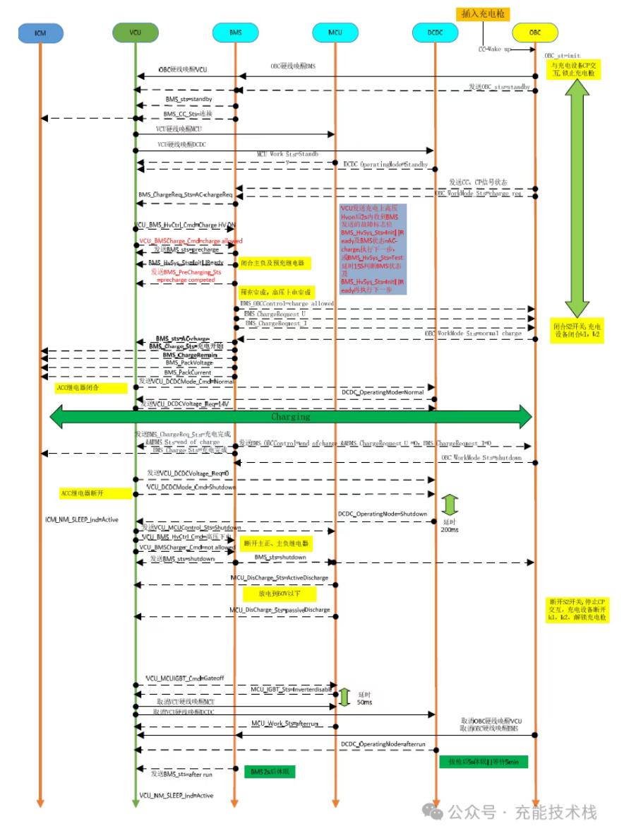 1) OBC 負(fù)責(zé)檢測(cè)判斷CC、CP 信號(hào)及喚醒BMS 及VCU、并周期發(fā)送,VCU 判斷整車(chē)是否允許充電、BMS 判斷電池包是否允許充電、ICM 顯示充電狀態(tài)信息,充電指示燈點(diǎn)亮等;