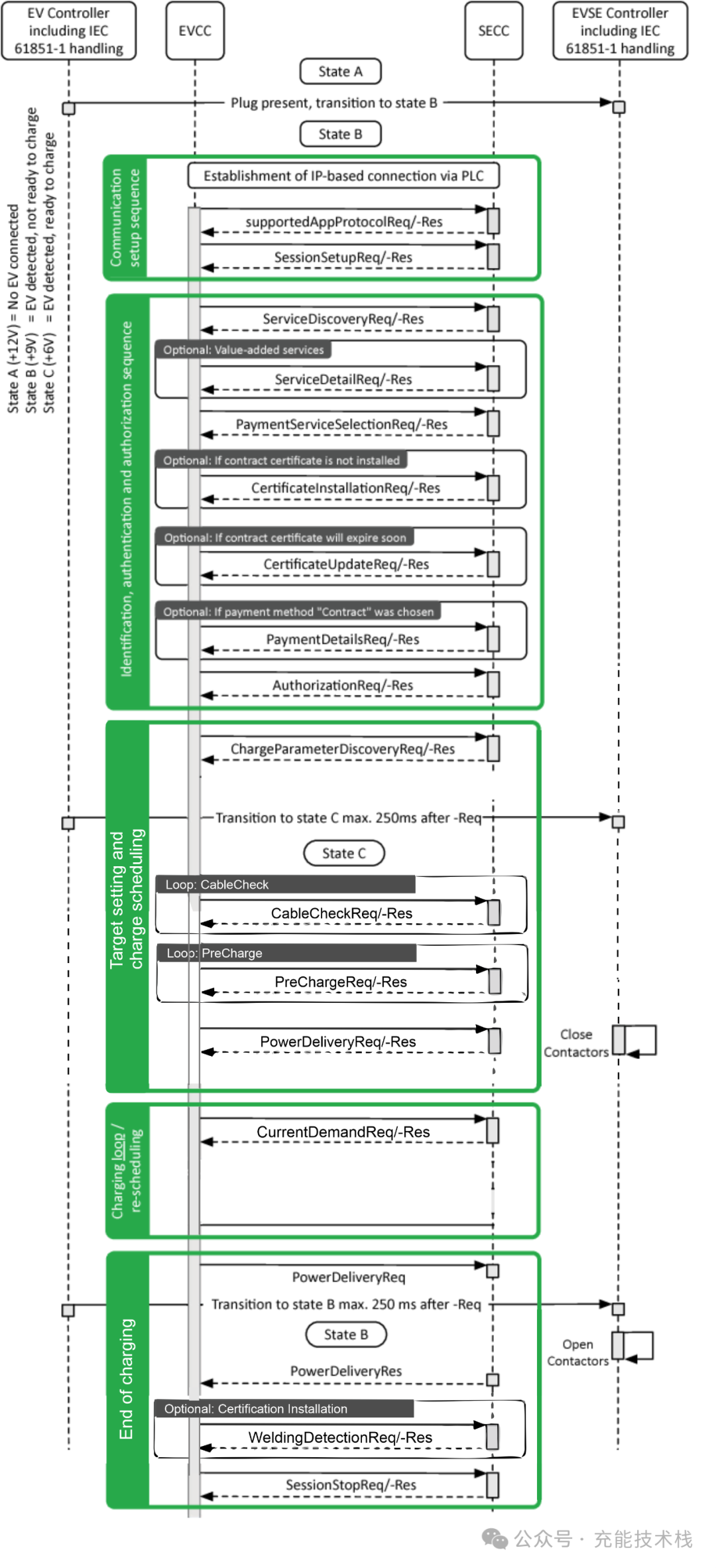 ISO 15118-2執(zhí)行的直流充電會(huì)話的充電過程如下圖所示。狀態(tài)A、B和C與充電站測(cè)量的CP電壓水平有關(guān),并在IEC 61851中進(jìn)行了定義。ISO 15118-2建立并擴(kuò)展了IEC 61851,并實(shí)現(xiàn)了EVCC和SECC之間的數(shù)字通信,如IEC 61851所定義,一旦脈寬調(diào)制(PWM)信號(hào)的占空比設(shè)置為5%,就會(huì)開始數(shù)字通信。