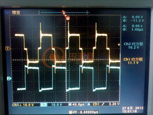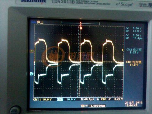 藍(lán)色為輸出直流的電壓波形,黃色為變壓器副邊的電壓波形。