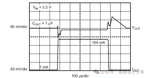 (2)輸出電容輸出電容相對(duì)于輸入電容復(fù)雜一點(diǎn),其中最為關(guān)鍵的一個(gè)考慮因素就是“瞬態(tài)響應(yīng)”。什么叫瞬態(tài)響應(yīng)?指的是:當(dāng)負(fù)載電流突然發(fā)生變化時(shí),LDO輸出的電壓做出發(fā)應(yīng)所需要的時(shí)間。