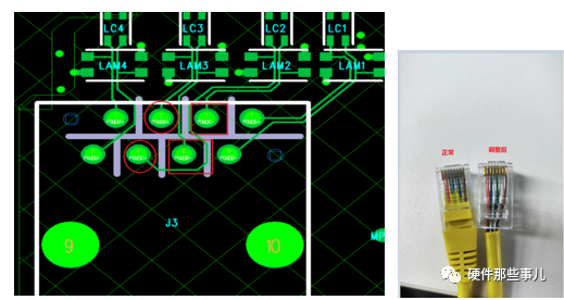 d.通過前面的測試和分析,我們已經(jīng)鎖定問題點在RJ45,最大懷疑就是RJ45的封裝是否正確。于是找出RJ45的規(guī)格核對封裝。--不知道大家看到下面下面兩個圖是否發(fā)現(xiàn)了異常?