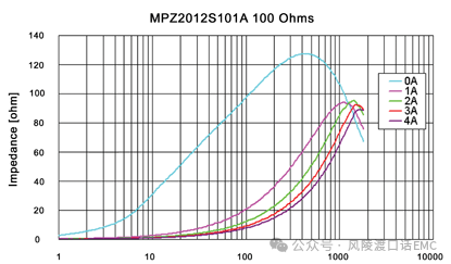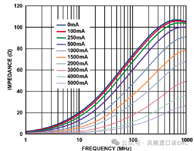 隨著偏置電流的增大,磁珠材料會出現(xiàn)飽和特性,導(dǎo)致鐵氧體磁珠電感下降,電感的飽和程度根據(jù)磁芯材料不同。直流偏置電流的影響可通過不同頻率下阻抗值的減少來確定,阻抗降低意味著噪聲抑制能力的下降,下圖顯示鐵氧體磁珠阻抗如何隨著直流偏置電流的變化而改變。
