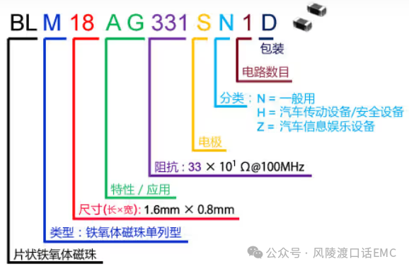 目前磁珠的型號命名方法,業(yè)界沒有統(tǒng)一的標(biāo)準(zhǔn),生產(chǎn)廠家通常會采用自家命名規(guī)則。一般都會給出尺寸、材料、阻抗、包裝方式等信息,下圖是村田貼片磁珠的命名規(guī)則。