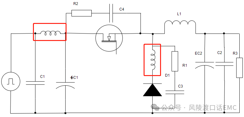 DC-DC功率電流環(huán)路存在高頻電流噪聲,高頻電流噪聲環(huán)路面積大小、噪聲電流的大小決定了輻射發(fā)射測試結(jié)果。EMC調(diào)試時通常會在高頻電流環(huán)路中增加磁珠來抑制高頻噪聲,