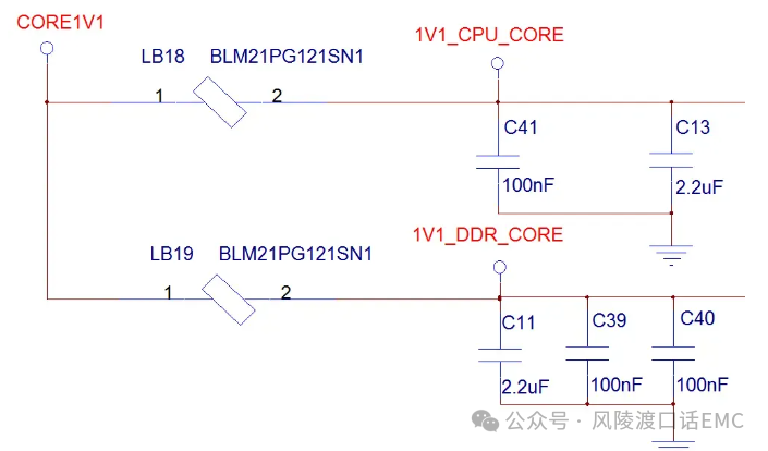SOC芯片由于高速集成,內(nèi)部模塊電路眾多,不同模塊電路可能使用相同的供電電壓,為防止不同模塊間的噪聲干擾通過供電電源串?dāng)_耦合,通常做法是在不同模塊電源之間用磁珠隔離,抑制模塊間噪聲耦合。