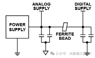 不同的電路模塊、不同類型信號處理芯片使用相同的供電電源時,為了防止噪聲通過電源線耦合到不同的電路模塊,通常做法是在不同電路模塊的供電電源之間用磁珠隔離,抑制模塊間噪聲耦合。