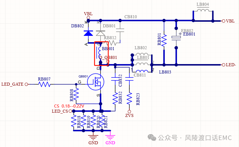 DC-DC電路中功率器件的寄生電容與環(huán)路中的寄生電感,容易發(fā)生高頻寄生振蕩,產(chǎn)生高頻噪聲,EMC調(diào)試時通常也會在高頻環(huán)路中增加磁珠來抑制寄生振蕩,具體磁珠的使用可以參考下圖所示: