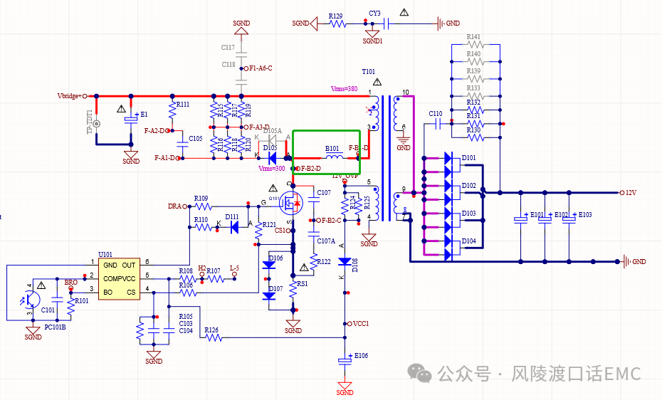 在隔離開關(guān)電源的高壓側(cè)、低壓側(cè),為抑制環(huán)路中的高頻電流噪聲,通常會在環(huán)路中增加串聯(lián)磁珠,抑制高頻噪聲干擾。主要應(yīng)用場景包括反激電路、Boost電路、LLC電路、Boost電路等,具體情況應(yīng)根據(jù)實際調(diào)試結(jié)果而定,非必要對策。