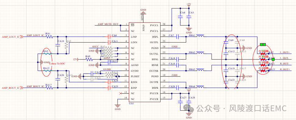 在數(shù)字功放輸出端通常采用電感電容組成的LC低通濾波器,濾除數(shù)字功放芯片產(chǎn)生的高頻噪聲,由于電感寄生電容的影響,高頻噪聲被耦合到后級,通過喇叭線形成天線效應(yīng)向外空間輻射。