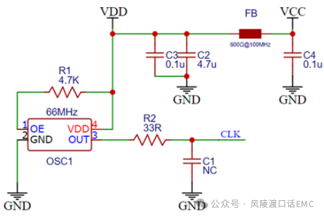 有源晶振輸出是方波信號,存在豐富的高次諧波,高次諧波的耦合路徑主要是其供電電源和輸出時鐘信號,通常會在其供電電源增加磁珠低通濾波器,濾除其高次諧波噪聲。