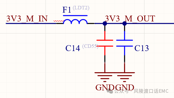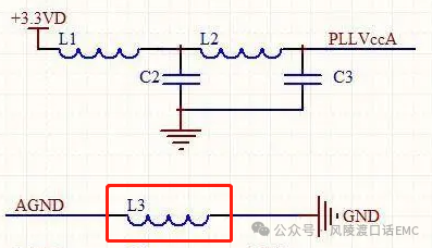 時鐘信號,尤其是方波時鐘信號,存在豐富的高次諧波,使用RC濾波時,電阻阻值的參數(shù)選擇空間有限,需要使用磁珠濾除高頻噪聲干擾,下圖是典型的應(yīng)用電路。