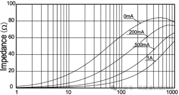 廠家提供的磁珠阻抗頻率曲線,一般是在很小偏置電流下測得,而電流對磁珠的阻抗影響很大。在通過大電流時,隨著偏置電流的增大,磁性材料會出現(xiàn)飽和的特性,導(dǎo)致L降低,從而導(dǎo)致工作區(qū)域的偏移,會影響到噪聲的抑制效果,磁珠阻抗隨電流變化曲線如下圖所示: