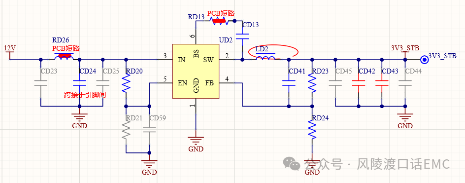 上圖為抑制通過DC-DC輸入電源引腳耦合的噪聲干擾,在DC-DC輸入電源引腳上直接串聯(lián)磁珠,高頻噪聲電流流過磁珠時產(chǎn)生的高頻電壓尖峰超過DC-DC供電電源的額定電壓,造成DC-DC芯片過壓擊穿損壞。