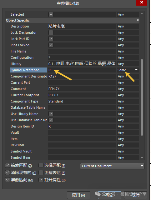 (3)在界面中找到原理圖所有電阻的“共同點”,比如下圖中的“Symbol Reference”,這個共同點不是固定的,需要視具體情況而定,然后再把右側(cè)中的“Any”切換成“Same”,最后點擊“確定”。