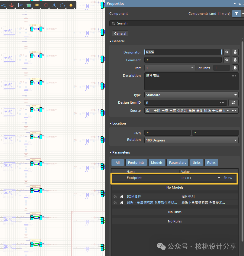 (6)這個時候就可以在右側(cè)的“Properties”中的“Footprint”選擇合適的封裝了,到此所有的電阻的封裝就一次性添加完了。